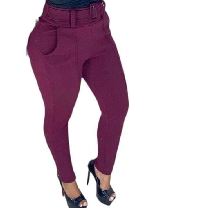 Calça feminina skinne malha crepe com cinto fixo com fivela.