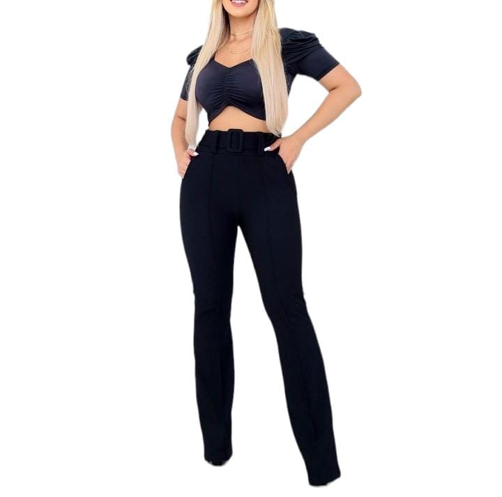 Calça em modelagem flare confeccionada em tecido malha crepe, uma malha com alta elasticidade, gramatura média e textura sutil. A calça possui detalhe de cinto fixo e nervura na parte frontal. Possui bolsos laterais. Peça perfeita para ousar sem perder a elegância. Combine com blusas neutras e acessórios contrastantes e tenha uma peça para o dia e a dia para a noite